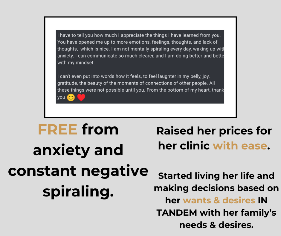 Instead of buying yet another parenting book on how to get your kids to listen so that you can yell at them less, we address the origin of what triggers your highly charged emotions in the first place. We shift from negative mental spirals, overwhelm, and feeling constant pressure and stress to go go go to a new defaulted emotional response of joy, confidence and presence. Â